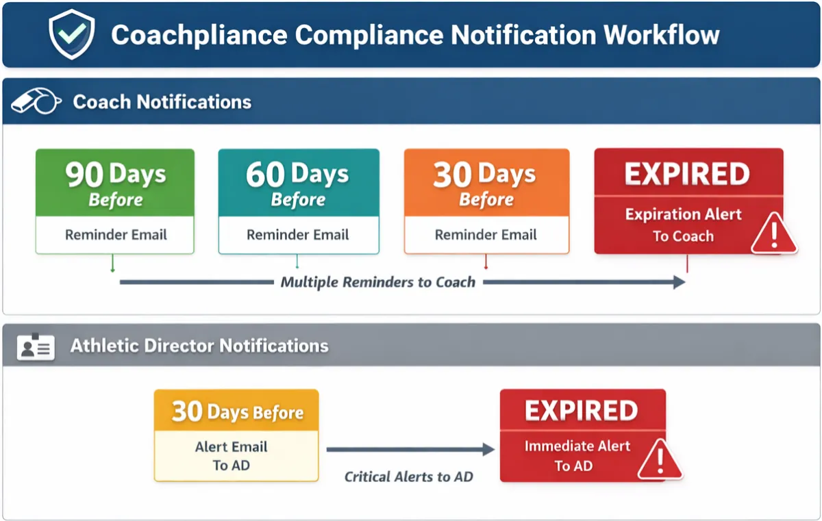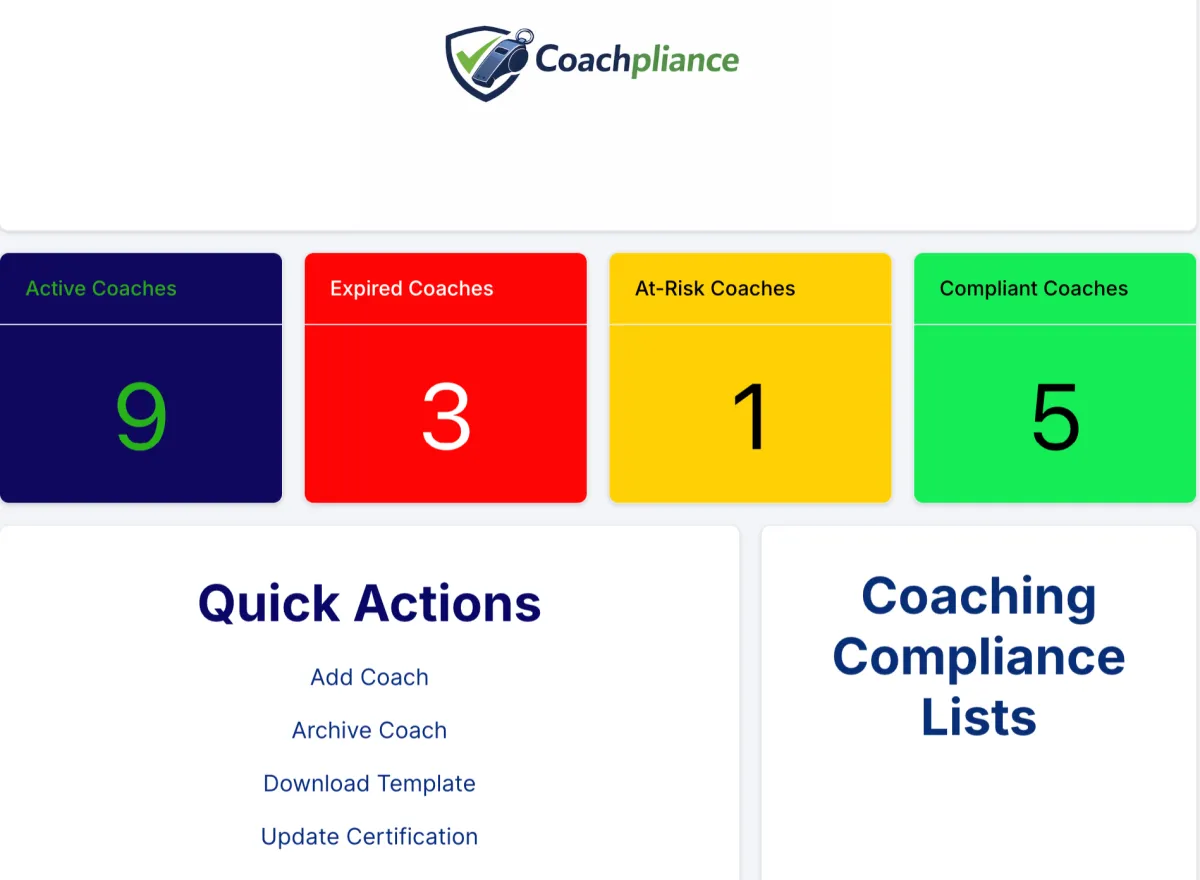Coachpliance is a risk management and compliance system built specifically for athletic departments. We help athletic directors centralize certification tracking, monitor training requirements, and eliminate expired credentials with real-time visibility and automated alerts. Our platform reduces liability, strengthens oversight, and ensures your coaches and staff stay compliant year-round.